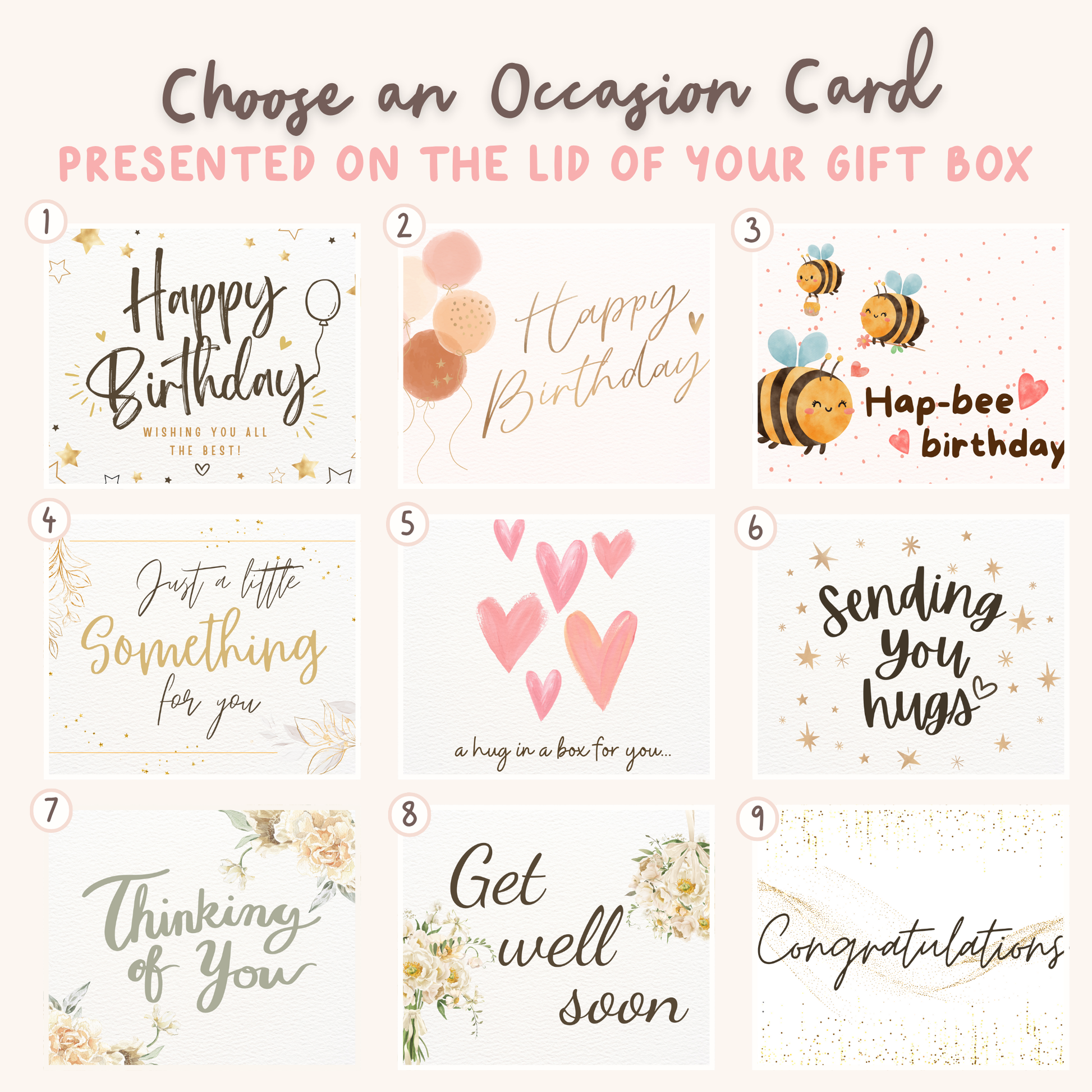 - Each gift is wrapped with love using tissue paper, shredded hamper filler, and a gift card with your personalised message.